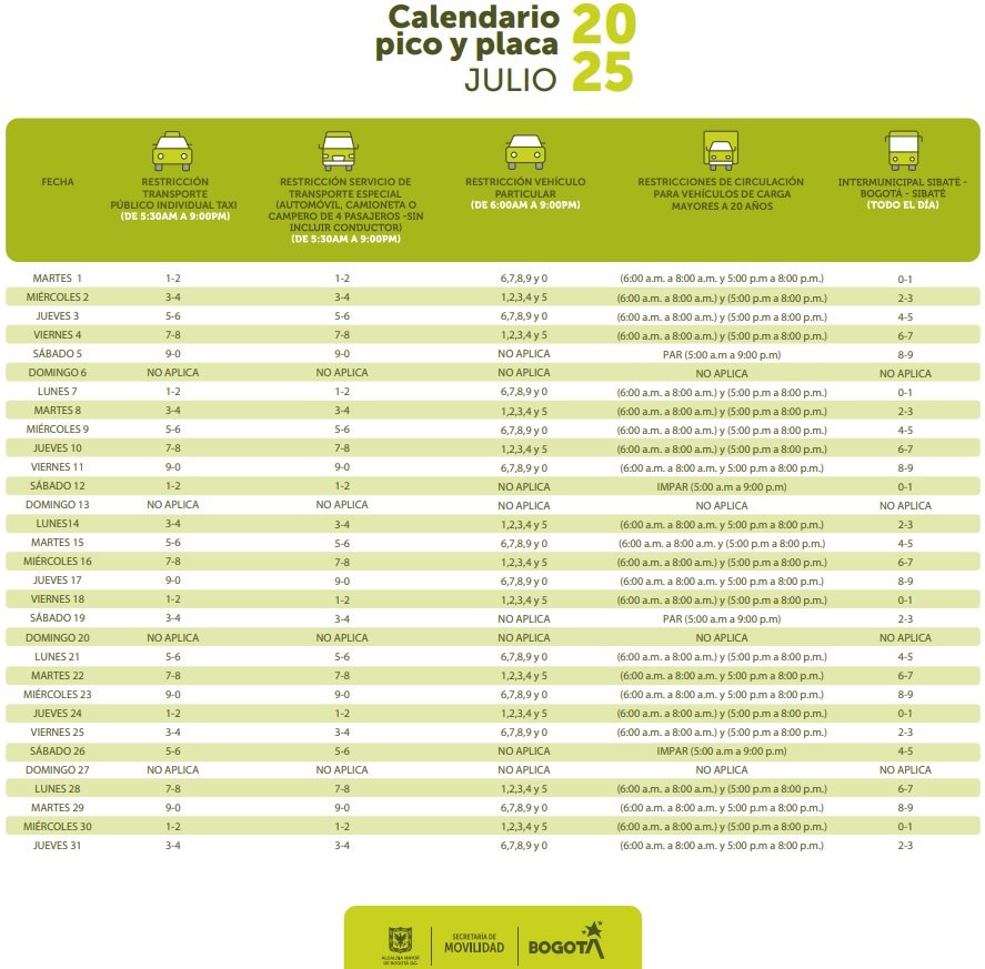 Pico y placa Bogotá Julio 2025